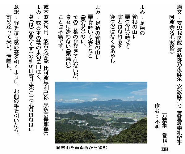 巻14-3364: 足柄の箱根の山に粟蒔きて実とはなれるを粟無くもあやし