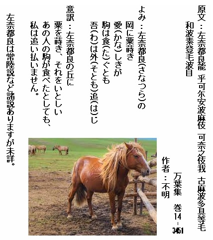 巻14-3451: 左奈都良の岡に粟蒔き愛しきが駒は食ぐとも我はそとも追じ