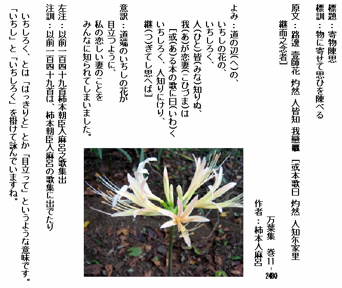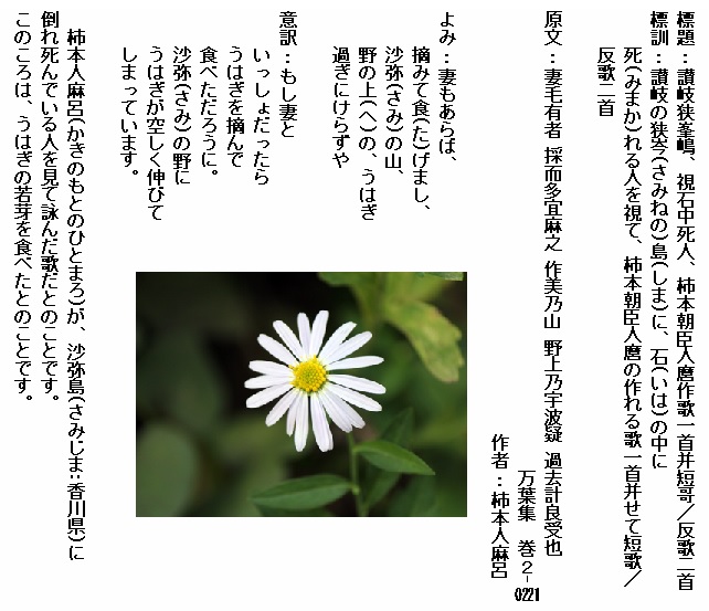 巻2-0221:妻もあらば摘みて食げまし沙弥の山野の上のうはぎ過ぎにけらずや