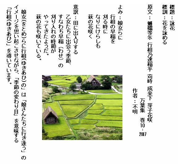 地味ながらも長く咲き続ける「おけらの花」、その花のようにひっそりと男を慕い続けている女。想いを男に言い表せないもどかしさ。東国の可憐な女性の秘めたる恋心です。