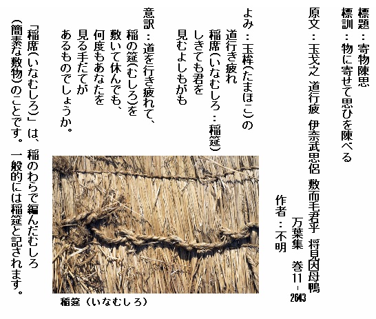 巻11-2643:玉桙の道行き疲れ稲席しきても君を見むよしもがも