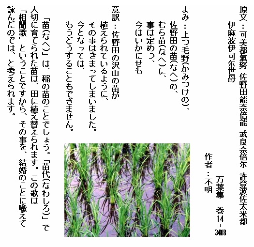 巻14-3418:上つ毛野佐野田の苗のむら苗に事は定めつ今はいかにせも