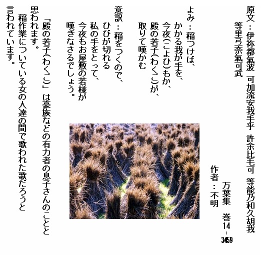 巻14-3459:稲つけばかかる我が手を今夜もか殿の若子が取りて嘆かむ