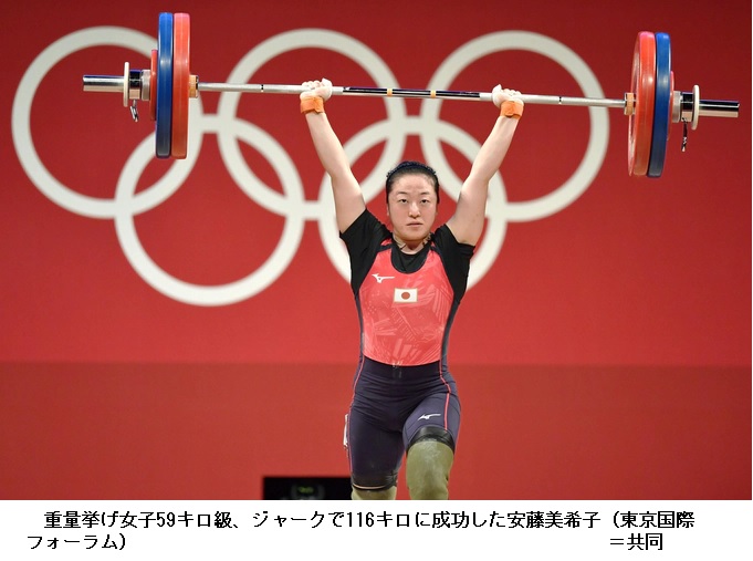重量挙げ女子59キロ級で安藤美希子(FAコンサルティング)がトータル214キロをマークして銅メダルを獲得した。日本女子では2012年ロンドン五輪、16年リオデジャネイロ五輪で連続メダルを獲得した三宅宏実(いちご)に続く3大会連続の表彰台となった。スナッチで94キロ、得意のジャークで120キロを挙げた。