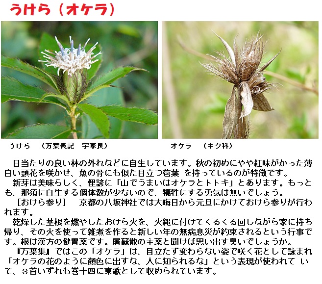 「うけら」は薬草として知られている「おけら」のことです。キク科の多年草です。日当たりの良い山地に生え、9月~10月頃に白い花を咲かせます。たまに、紅い花もあるそうです。