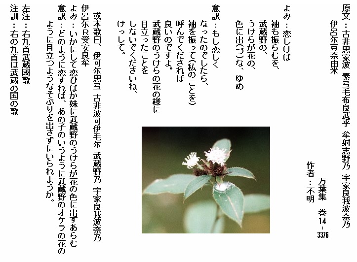 巻14-3376:恋しけば袖も振らむを武蔵野のうけらが花の色に出なゆめ