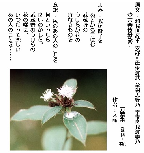巻14-3379:我が背子をあどかも言はむ武蔵野のうけらが花の時なきものを