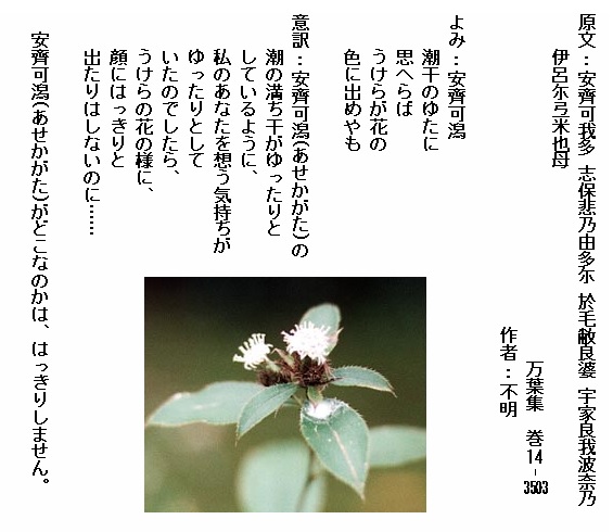 巻14-3503:安齊可潟潮干のゆたに思へらばうけらが花の色に出めやも