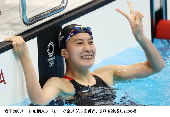 女子200メートル個人メドレーで大橋悠依(イトマン東進)が2分8秒52で金メダルを獲得し、400メートル個人メドレーとの2冠を達成した。競泳の日本勢で金メダルを複数つかんだのは男子平泳ぎで2004年アテネ、08年北京と2大会連続2冠に輝いた北島康介以来で、日本の女子選手が同一大会で金メダル2個を獲得するのは夏季五輪では初めて。