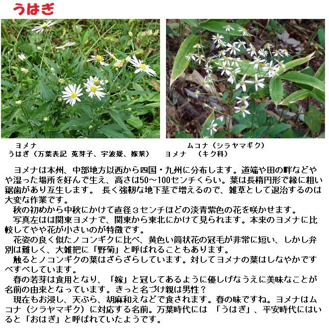 「うはぎ」とは、キク科の多年草の嫁菜(よめな)とされています。田のあぜ道などで見ることができます。7月~10月にかけて淡い紫色の花をつけます。なお、写真はカントウヨメナで関東から東北にかけてみることができます。中部地方から西に見ることができる「ヨメナ」より花がひとまわり小さいのです。
