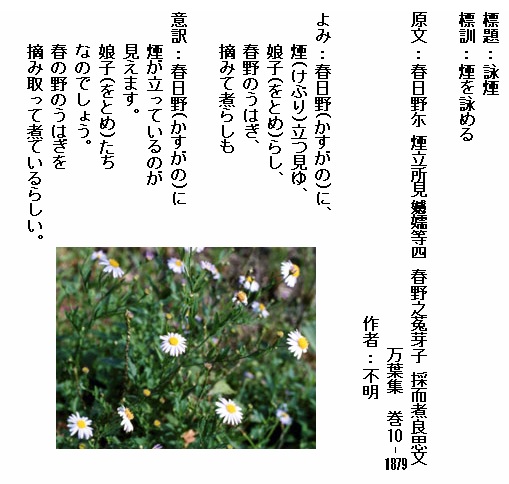 巻10-1879:春日野に煙立つ見ゆ娘子らし春野のうはぎ摘みて煮らしも