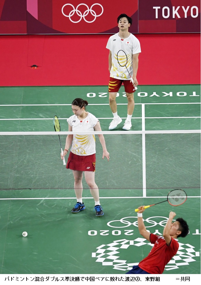 混合ダブルス準々決勝で、渡辺勇大、東野有紗組(日本ユニシス)はデチャポン、サプシリー組(タイ)に2-1で逆転勝ちし、同種目で日本勢初の4強入りを果たした。1次リーグの女子シングルスはL組の山口茜(再春館製薬所)がギルモア(英国)に2-0で勝ち、前回リオデジャネイロ大会銅メダルでE組の奥原希望(太陽ホールディングス)はコセツカヤ(ROC)にストレート勝ちし、ともに2連勝の1位で決勝トーナメント進出を決めた。