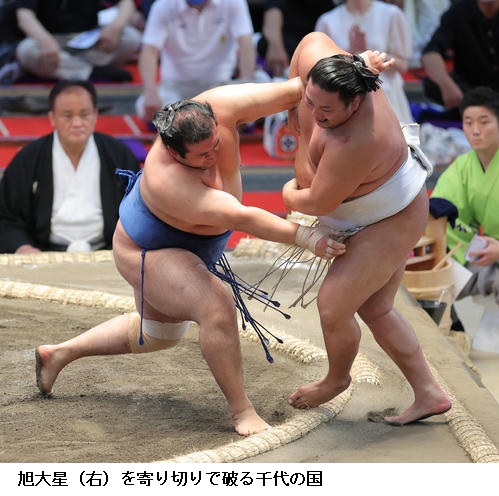 ▽千代の国に十両の旭大星は千代の国が寄り切り。