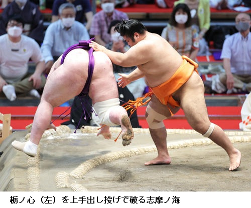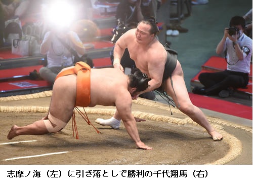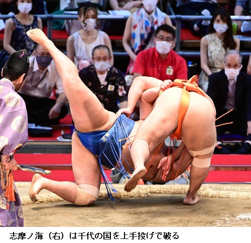 ▽志摩ノ海に千代の国は志摩ノ海が上手投げで勝ち越しました。