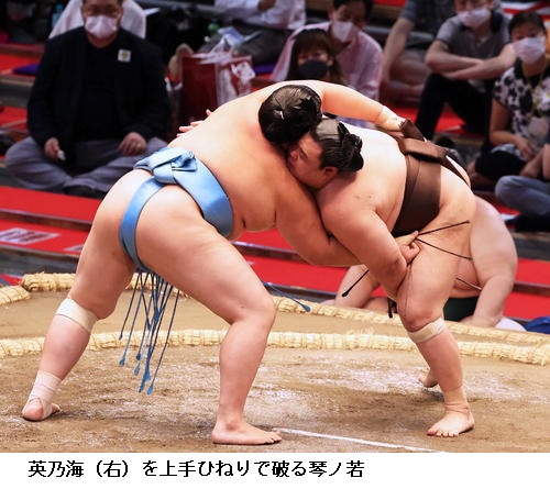 ▽英乃海に琴ノ若は琴ノ若が上手ひねりでただひとり1敗を守りました。