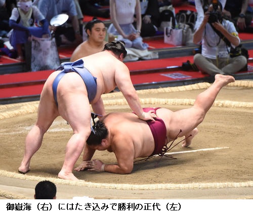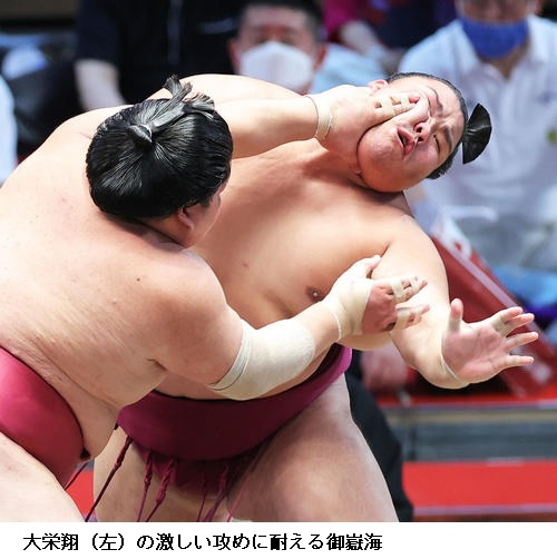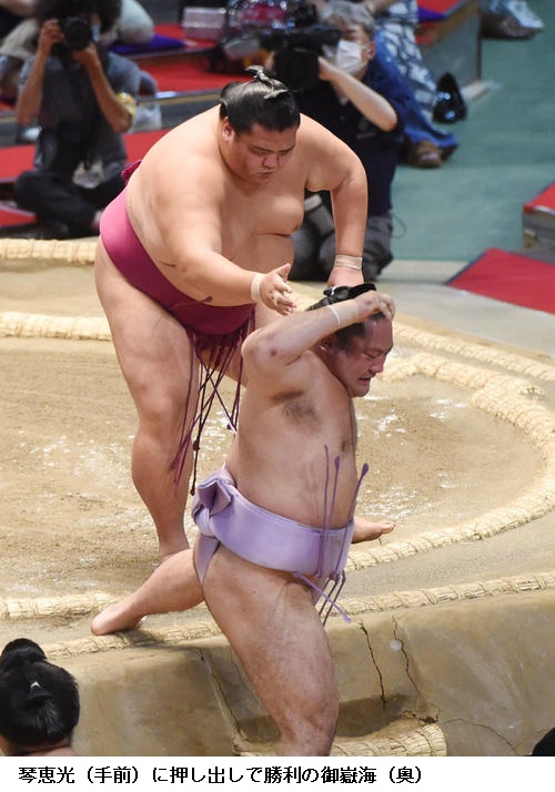 ▽大栄翔に関脇・御嶽海は御嶽海がはたき込みで勝ちました。