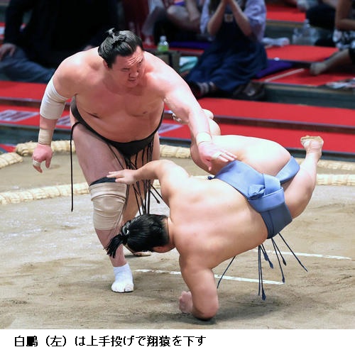 ▽横綱・白鵬に翔猿は白鵬が上手投げで勝って7連勝です。