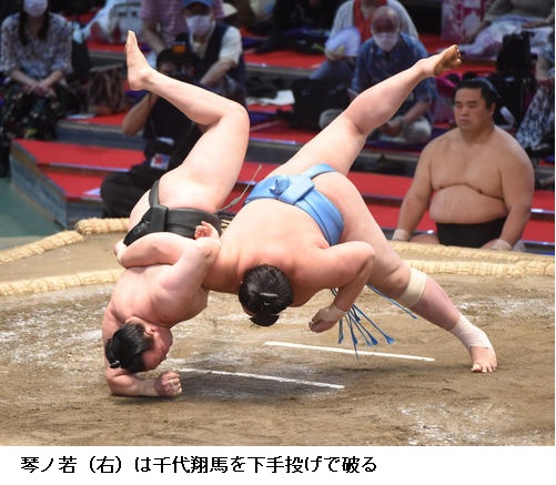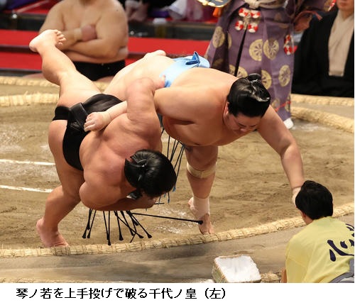 ▽琴ノ若に千代ノ皇は、行司軍配差し違えで、千代ノ皇が上手投げで勝ちました。琴ノ若は2敗に後退です。
