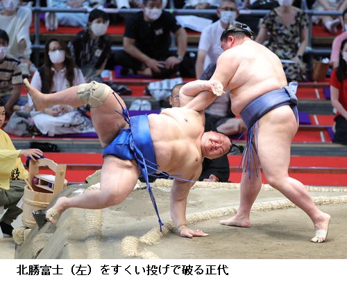 ▽北勝富士に大関 正代は、正代がすくい投げで勝ちました。正代は星を五分に戻し「最後は何とかすくい投げにいけたが、押し込まれているのが気になる。ここから連勝できるようにしたい。まずは勝ち星を先行させていけたら」とほっとした様子でした。
