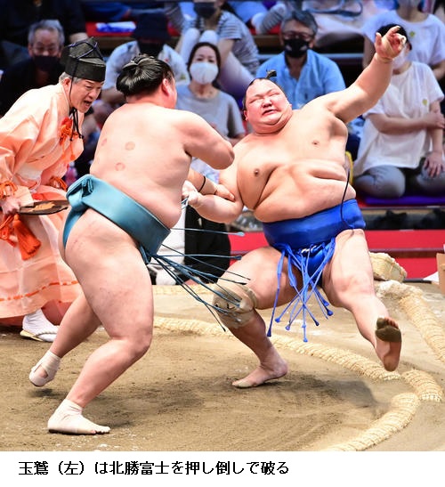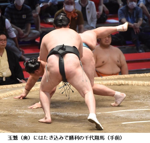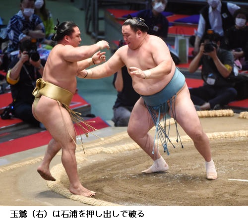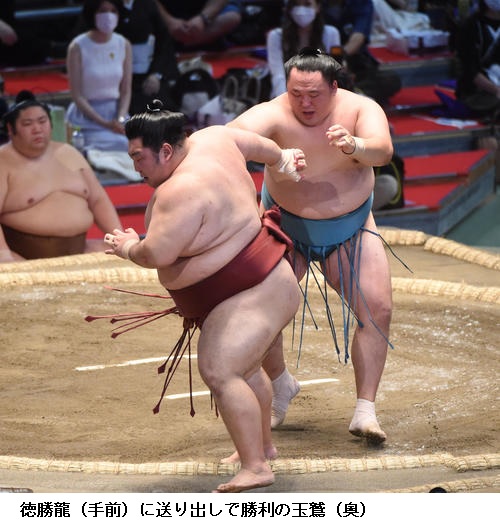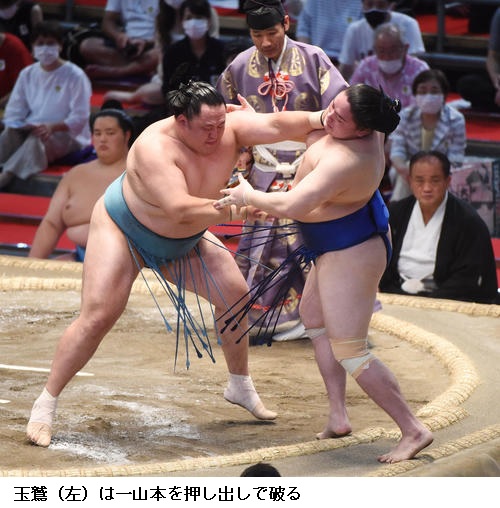 玉鷲は5勝目を挙げ「最後まで押し切った。なるべく突き放して、押してよかったと思います。またあしたから自分の元気のいい相撲を見せますので」とご機嫌でした。