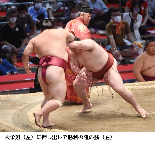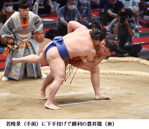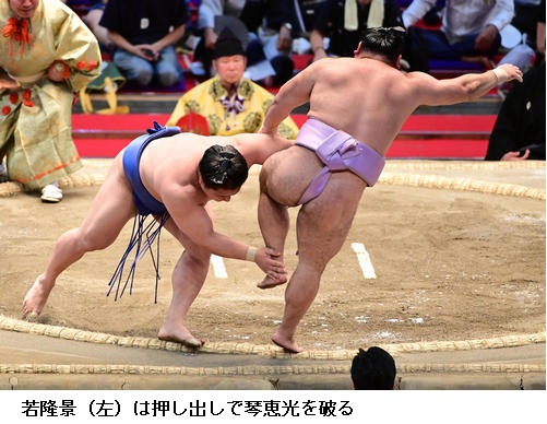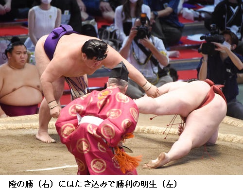 若隆景は明生との新小結どうしの一番を制し「下からよく攻めることができたと思います。足の動きは悪くはないかなと思います。一日一番、しっかり相撲を取りきることを意識していきたい」と振り返っていました。