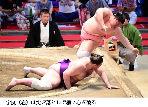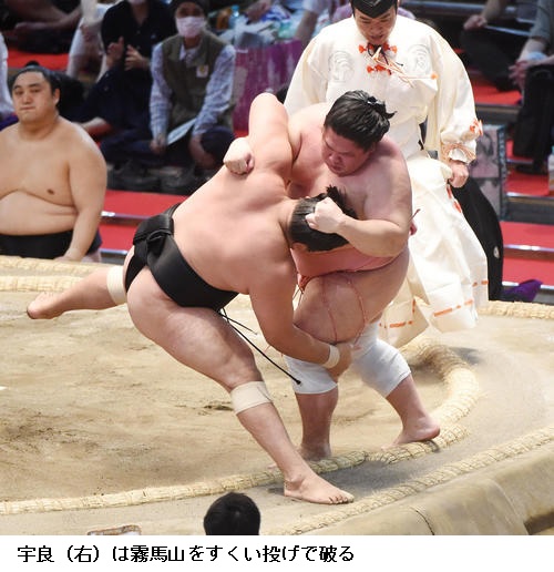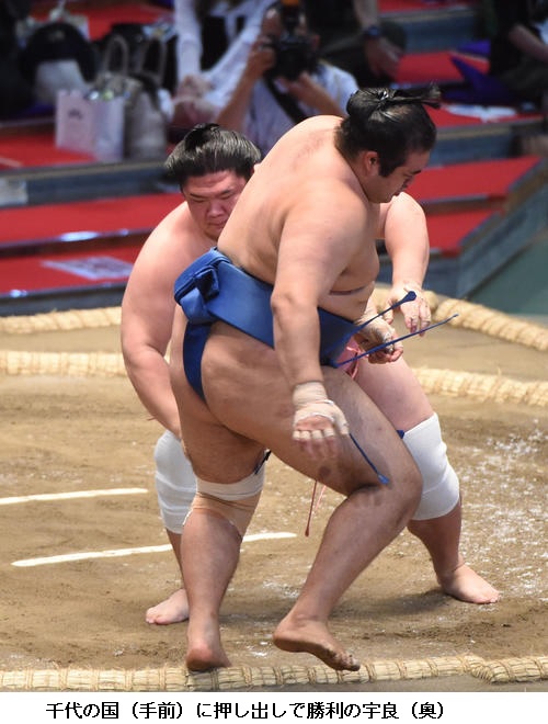 返り入幕の宇良は力強い相撲で新小結の明生を破り9勝目で「きのう、対戦相手を見た時、勝ちたいなという思いが特に強くなった。力を出し切れてよかった。けがしないように、最後まで相撲を取りきれるように頑張る」とふた桁白星に向け意気込んでいました。