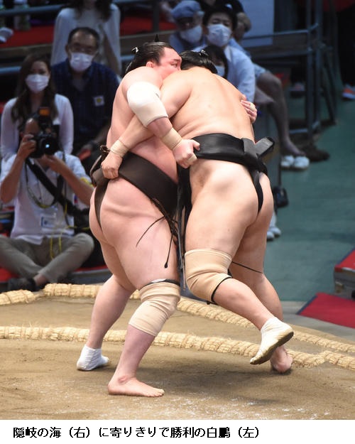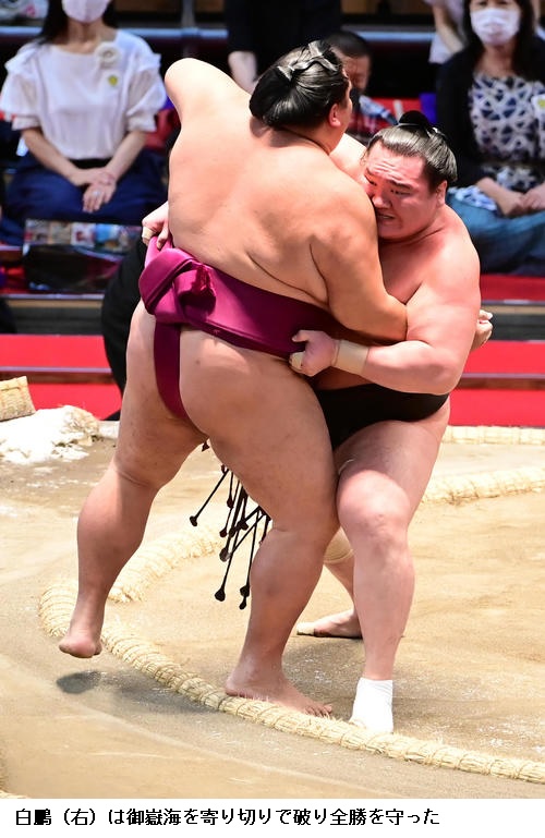 NHKの太田雅英アナウンサーは、勝った後のガッツポーズについて「抑えなければいけないところだったと思いますが」と触れると、北の富士氏は「何かもう…、ここまで今まで45回優勝見ているけどね、何かあったかね? えらい力んどるね。何かあったかね?」と白鵬の感情の高ぶりに驚きを隠せなかった。舞の海氏は「しかし、余裕はありませんでしたね。精神的にも肉体的にも余裕がないから、ああいう相撲を取るんでしょうね」と解説した。 [日刊スポーツ 2021年7月18日18時1分]
