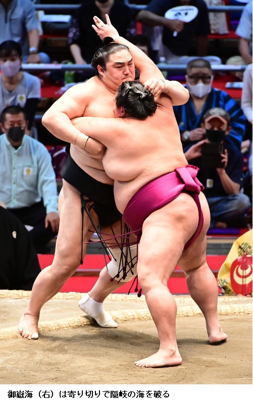 ▽隠岐の海に妙義龍は隠岐の海が寄り切り。