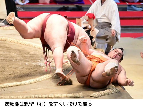 ▽徳勝龍に魁聖は徳勝龍がすくい投げ。魁聖は負け越しました。