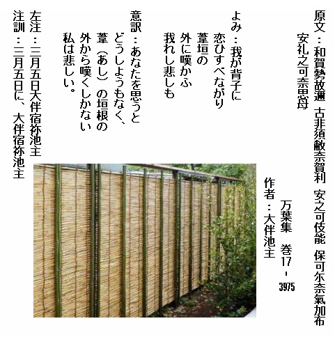 巻17-3975:我が背子に恋ひすべながり葦垣の外に嘆かふ我れし悲しも