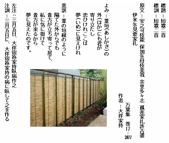 巻17-3977:葦垣の外にも君が寄り立たし恋ひけれこそば夢に見えけれ