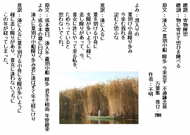 巻12-2998:港入りの葦別け小舟障り多み今来む我れを淀むと思ふな