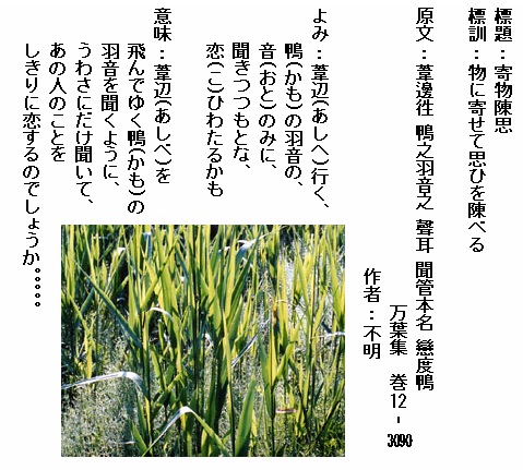 巻12-3090:葦辺行く鴨の羽音の音のみに聞きつつもとな恋ひわたるかも