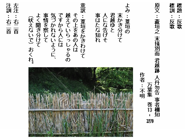 巻13‐3279:葦垣の末かき分けて君越ゆと人にな告げそ事はたな知れ