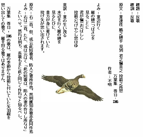 巻13‐3345:葦辺行く雁の翼を見るごとに君が帯ばしし投矢し思ほゆ