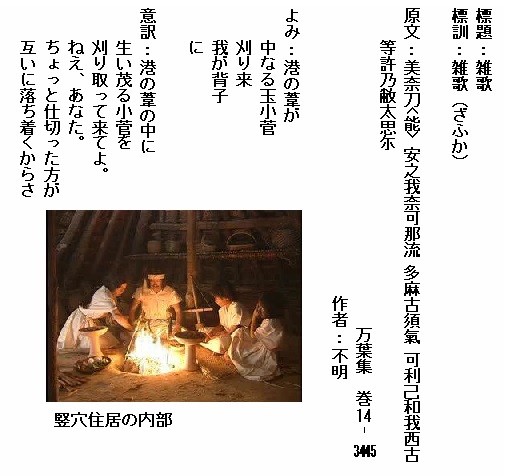 港の遊行女婦が宴会などで歌った、との説もあります。皆の笑いを誘い、楽しい会になるのでしょう。あるいは、葦苅り作業中の女たちの歌、とも。当時の状況、生活様式ならではの歌です。