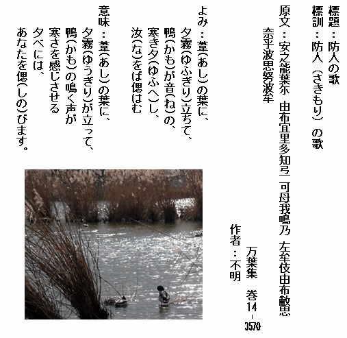 巻14-3570:葦の葉に夕霧立ちて鴨が音の寒き夕し汝をば偲はむ