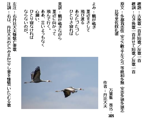 巻15-3626:鶴が鳴き葦辺をさして飛び渡るあなたづたづしひとりさ寝れば