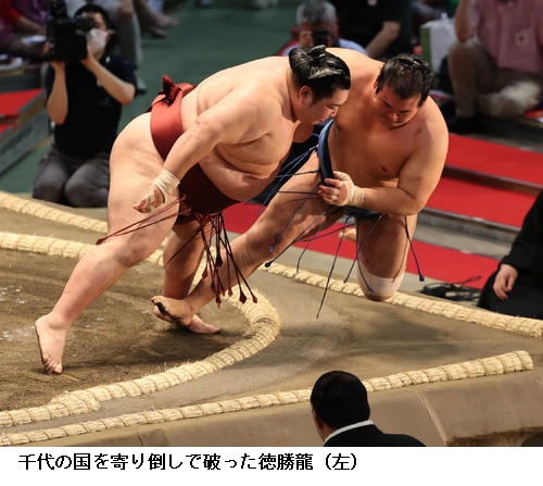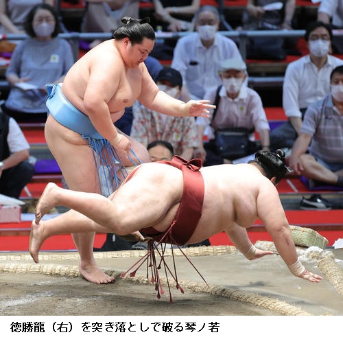 ▽琴ノ若に徳勝龍は、琴ノ若が突き落としで1敗を守りました。