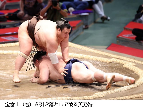 ▽宝富士に志摩ノ海は宝富士が突き落とし。