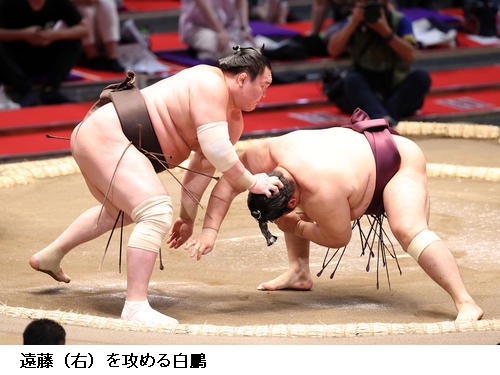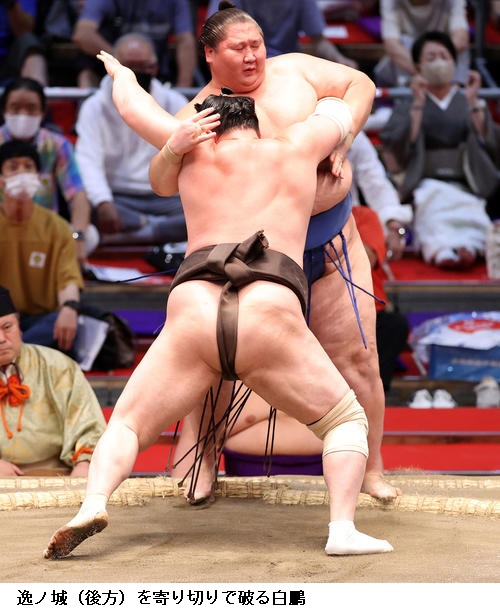 ▽横綱 白鵬に前頭2枚目の逸ノ城は白鵬が寄り切り。
