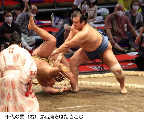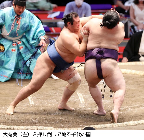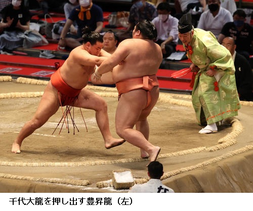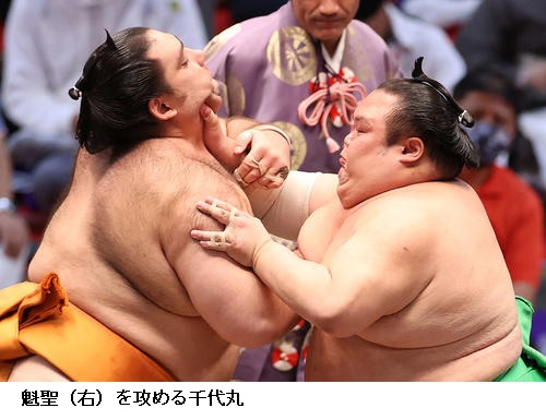 ☆千代丸 5日間で一番いい相撲だったと思う。(魁聖は)大きい相手なんで思い切りいけた。