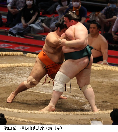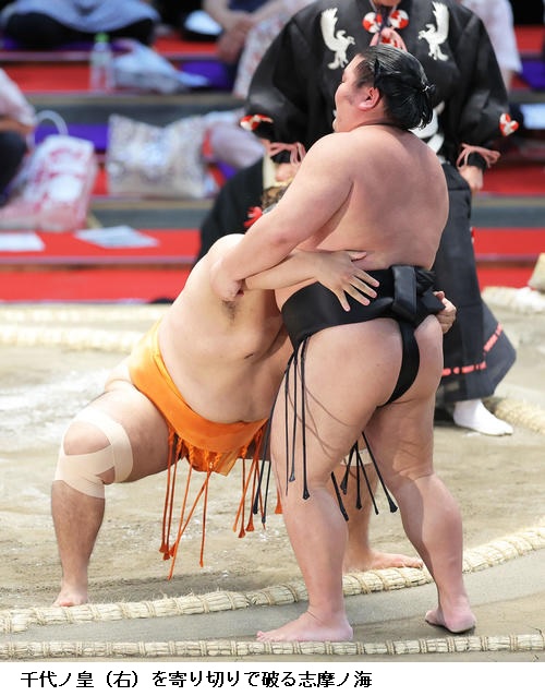 ▽志摩ノ海に千代ノ皇は、志摩ノ海が寄り切り。