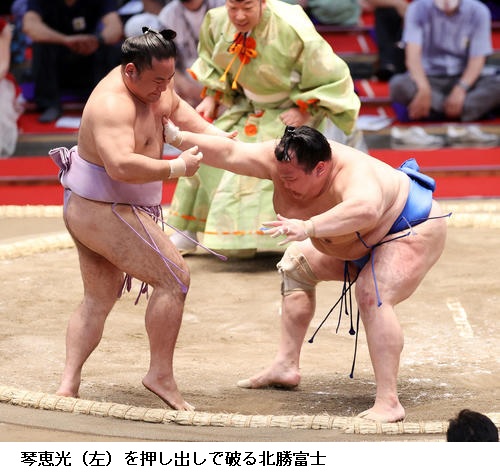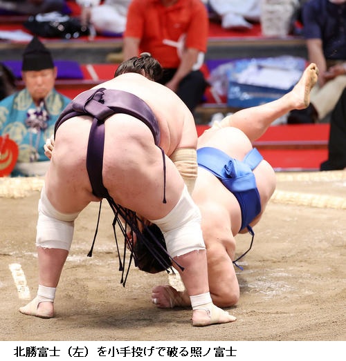 ▽綱とりに挑む大関 照ノ富士に北勝富士は照ノ富士が小手投げで勝って5連勝です。