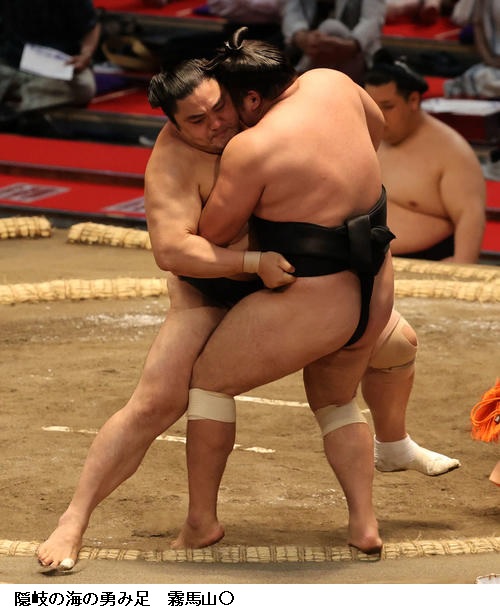 ▽隠岐の海に霧馬山は隠岐の海に勇み足があり、行司軍配差し違えで霧馬山が勝ちました。