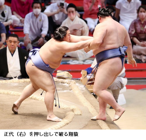 ▽大関 正代に翔猿は翔猿が押し出しで勝ちました。