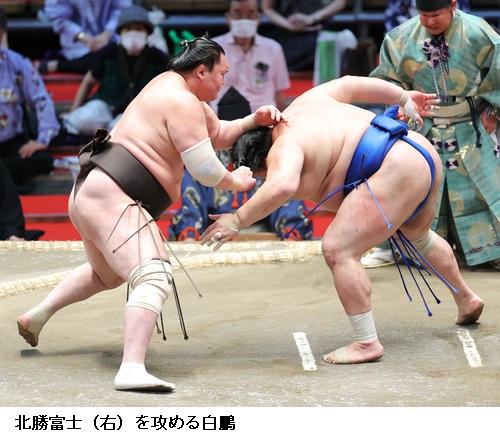 ▽北勝富士に横綱 白鵬は、白鵬がはたき込みで勝って、休場明けの場所で6連勝です。