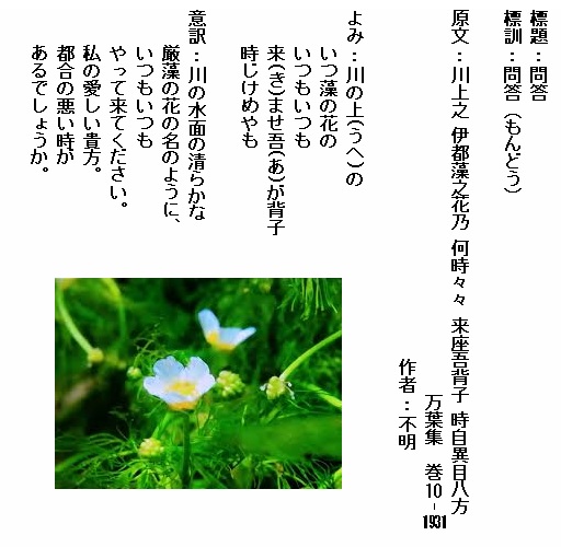 巻10‐1931: 川の上のいつ藻の花のいつもいつも来ませ我が背子時じけめやも