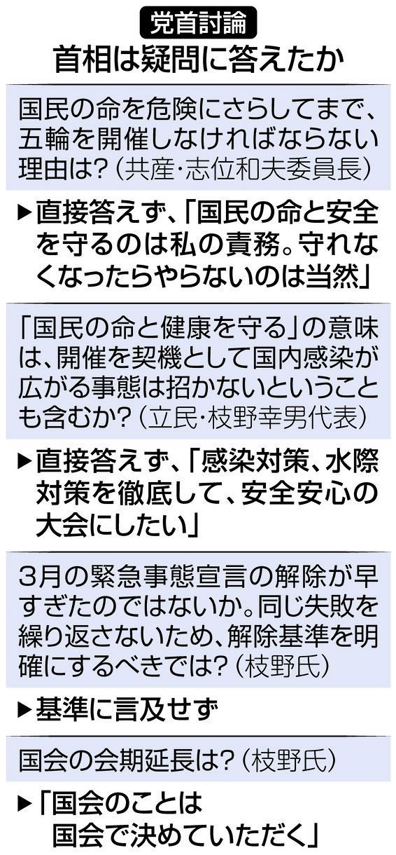 共産党の志位和夫委員長は、政府の新型コロナ対策分科会の尾身茂会長が五輪開催に伴う感染拡大リスクを「ゼロにできない」と指摘したことに触れ、それでも開催しなければならない理由を2回にわたって追及。首相は「尾身氏の意見も参考に感染対策の詰めを行う」「国民の命と安全を守れなければ(大会を)やらないのは当然」との従来の見解を示すにとどめた。