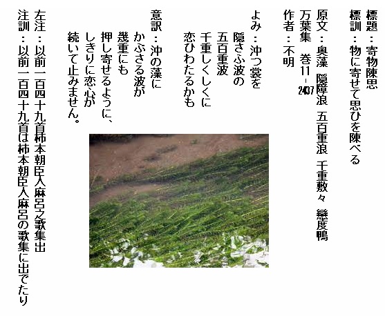 巻11-2437:沖つ裳を隠さふ波の五百重波千重しくしくに恋ひわたるかも
